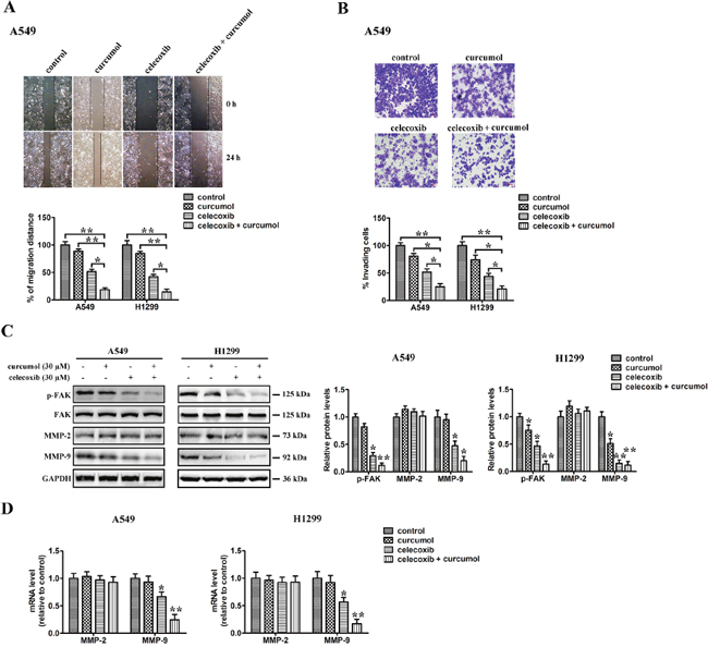 Figure 6: Effect of celecoxib and curcumol on cell migration. (A) Wound healing assays. A549 and H1299 cells were treated with celecoxib (30 μM) and/or curcumol (30 μM). Photographs were taken immediately and after 24 h of creating the scratch. Images shown are representative of three independent experiments. (B) Transwell assay. A549 and H1299 cells were treated with celecoxib (30 μM) and/or curcumol (30 μM). After 16 h pretreatment and 9 h incubation in the upper chamber, the cells migrating to the lower membrane were stained and counted in five fields with a magnification of × 100. N = 3, bar = 50 μm. The experiments were carried out in triplicate and representative data are shown. (C) Effects of celecoxib and curcumol on FAK, p-FAK, MMP-2 and MMP-9 protein expression. A549 and H1299 cells were treated with celecoxib (30 μM) and/or curcumol (30 μM). 24 h later, cells were harvested for Western blotting analysis using indicated antibodies. The level of GAPDH served as the loading control. Band intensities were calculated using software Image J. Relative intensities are also shown. Data represent mean values of triplicate samples. (D) A549 and H1299 cells were treated with celecoxib (30 μM) and/or curcumol (30 μM). 24 h later, cells were harvested for RNA extraction and quantitative real time PCR using primers specific for human MMP-2, MMP-9, and GAPDH (internal control). Data represent mean values of triplicate samples. *p < 0.05, **p < 0.01.