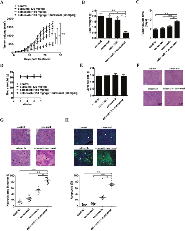 Figure 7: Celecoxib and curcumol combined therapy inhibits in vivo tumor xenograft growth in a subcutaneous tumor model. A549 cells were injected subcutaneously into the dorsal flanks of athymic nude mice. When tumors reached a size of approximately 50 mm3, mice were i.g. with celecoxib and i.p. with curcumol or the combination of two drugs every other day for a total of 25 days. (A) The tumor growth inhibitory effects of different treatments were compared. (B) At the end of the study, the excised tumors from each group were weighed. (C) Tumor double time of each group. (D) The weight of nude mice from each group did not change significantly during the experiment. (E) Liver weight of mice at the end of the experiment show in (A). (F) Representative photomicrographs of liver sections stained with H&E of mice treated with PBS, celecoxib, curcumol, or celecoxib + curcumol. (G) Determination of tumor necrosis after combined treatment with celecoxib and curcumol. Tumor necrosis areas are shown by H&E staining and observed under light microscope (×100). The viable tumor cells are indicated by a blue arrow. Tumor necrosis was determined by software Image J. Two sections/mouse and three mice were prepared. (H) Determination of apoptosis after combined treatment with celecoxib and curcumol. TUNEL assay was used to detect apoptotic cells (stained green and indicated with blank arrows) (× 200). The ratio of apoptotic cells to total cells: TUNEL positive cells were counted from three fields of the highest density of positive-stained cells in each section to determine the percentage of apoptotic cells. All data are shown as mean ± SD. *p < 0.05, **p < 0.01.