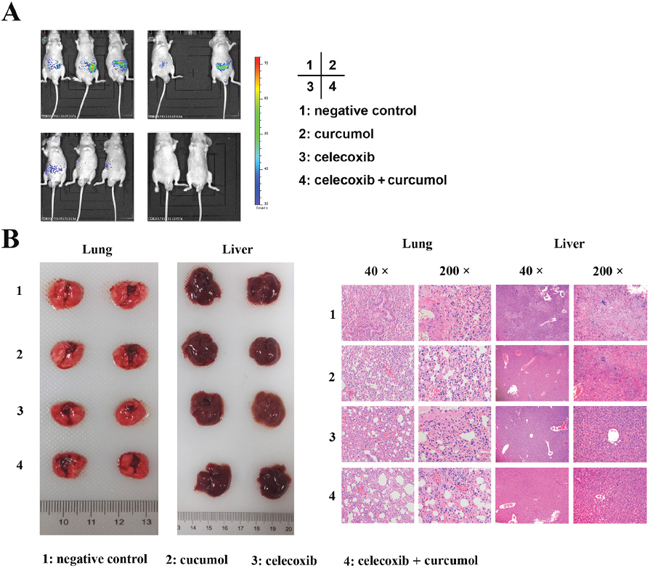 Figure 8: Celecoxib and curcumol combined therapy inhibits tumor metastasis in tail vein injection mouse model. A549 cells-xenografted nude mice (n = 8 per group) were i.g. with celecoxib and i.p. with curcumol or the combination of two drugs five times a week for a total of 6 weeks. (A) Bioluminescence imaging of whole bodies of nude mice after injection of A549-C8-luc for 35 days using the IVIS system. (B) Representative whole organ imaging and H&E tissue staining of nude mice injected with A549 cells. Lung (left) and liver (right) images with corresponding pathological analyses after tail vein injection for 6 weeks.