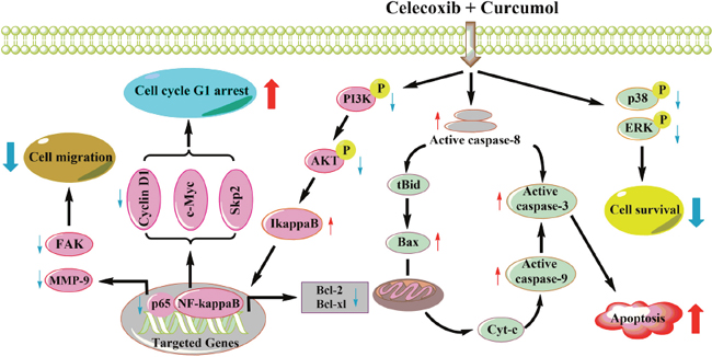 In conclusion, the present study provides convincing evidence that the combinative treatment with celecoxib and curcumol significantly reduced NSCLC cell proliferation, migration and invasion and induced cell apoptosis in vitro and inhibited A549 tumor growth and metastasis in vivo, whereas the single treatments did not markedly improve the anti-cancer effect. Further investigations into the molecular mechanism of action showed that celecoxib in combination with curcumol enhances the anti-proliferative and pro-apoptotic effects on NSCLC cells via actions on the anti-apoptotic AKT and ERK signaling pathways (Figure 9). Curcumol strengthens the anti-proliferative action of celecoxib, promoting NSCLC cell apoptosis and allowing for the use of lower dosages of celecoxib than those currently used. Therefore, it is worthwhile to consider this combinative treatment for NSCLC and warrants further evaluation in clinical trials.