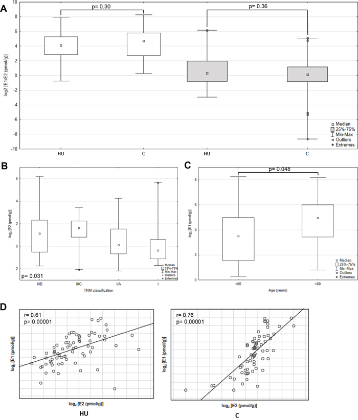 Figure 1: Intratissue estrone (E1) and estradiol (E2) concentrations in primary cancerous and histopathologically unchanged tissues from patients with CRC. (A) The cancerous (C) and histopathologically unchanged tissues (HU) from 75 patients with CRC were used for steroid fraction isolation, derivatization and measurement using ESI LC/MS. E1- white boxes; E2- grey boxes. (B) E2 concentrations isolated from cancerous tissue classified according to TNM: group IIIB, IIIC, IIA and I. (C) E1 concentrations isolated from cancerous tissue classified according to patients age at the time of tumor resection. (D) Correlation of intratissue E1 and E2 concentrations isolated from cancerous (C) and histopathologically unchanged tissues (HU) from 75 patients with CRC. The amounts of E1 and E2 are presented as log2- transformed data.
