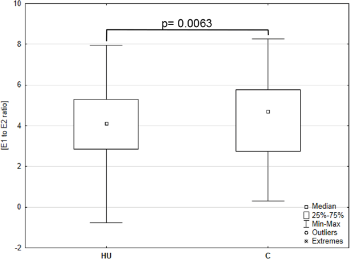 Figure 2: Intratissue estrone (E1) to estradiol (E2) ratio in primary cancerous and histopathologically unchanged tissues from patients with CRC. The cancerous (C) and histopathologically unchanged tissues (HU) from patients with CRC were used for steroid fraction isolation, derivatization and measurement using ESI LC/MS. E1 to E2 ratio was given for the 67 samples in cancerous and 73 in histopathologically unchanged CRC tissue.