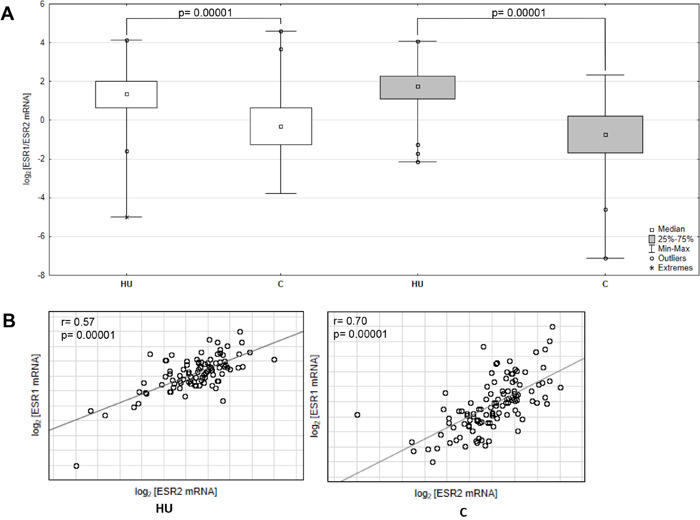 Figure 3: ESR1 and ESR2 transcript levels in primary cancerous and histopathologically unchanged tissue from patient with CRC. (A) The primary cancerous tissues from 110 patients with CRC were used for RNA isolation. Total RNA was reverse-transcribed, and cDNAs were investigated by RQ-PCR relative quantification analysis. The ESR1 and ESR2mRNA levels were corrected by the geometric mean of PBGD and hMRPL19 cDNA levels. ESR1- white boxes; ESR2- grey boxes. (B) Correlation of ESR1 and ESR2 transcript levels from cancerous (C) and histopathologically unchanged tissues (HU) from 110 patients with CRC. The amount of ESR1 and ESR2 mRNA was expressed as the log2 of multiples of cDNA copies in the calibrator.