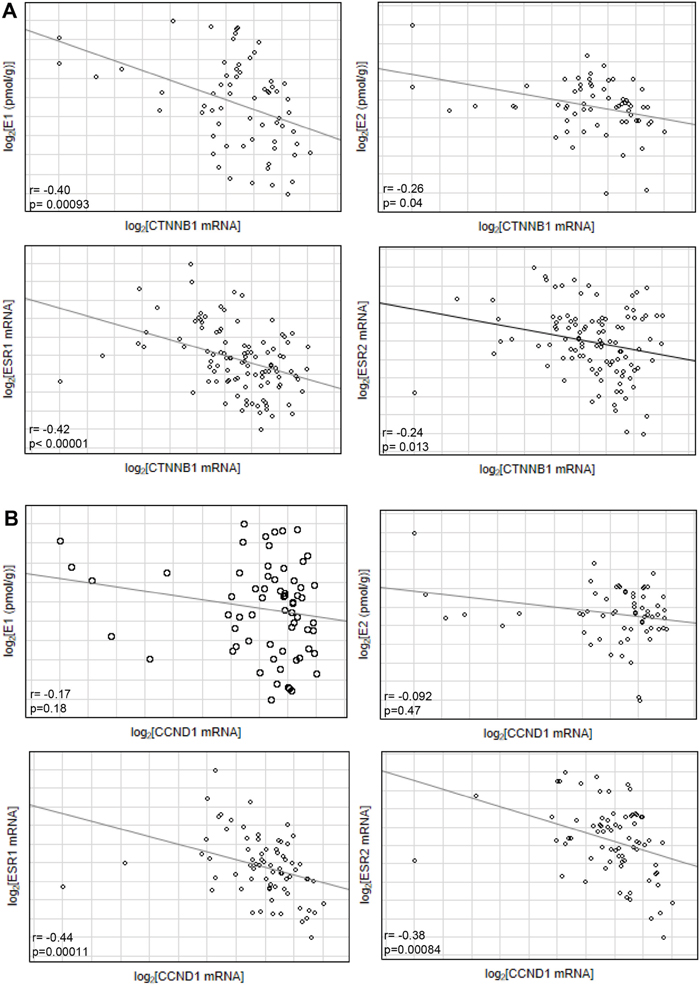 Figure 5: Correlation of estrogen concentration (E1/E2) or estrogen receptor transcript level (ESR1/ESR2) with CTNNB1 (A) and CCND1 transcript level (B) from cancerous tissues of CRC patients.