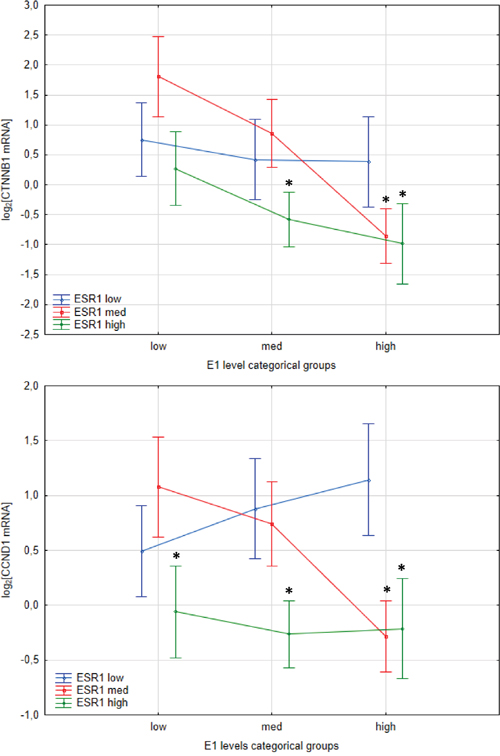 Figure 6: Interaction plots from two-way ANOVA presenting effect of E1 concentration level and ESR1 status on CTNNB1 and CCND1 mRNA expression level in cancerous tissues of CRC patients. Values are means ± SE. Post-hoc p-values: CTNNB1: low E1-low ESR1 vs. high E1-high ESR1 p=0.06; low E1-med ESR1 vs. high E1-high ESR1 p=0.005; low E1-med ESR1 vs med E1-high ESR1 p=0.005; low E1-med ESR1 vs high E1-med ESR1 p=0.001. CCND1: high E1-low ESR1 vs low E1-high ESR1 p=0.073; high E1-low ESR1 vs med E1-high ESR1 p=0.022; high E1-low ESR1 vs high E1-high ESR1 p=0.05; low E1-med ESR1 vs high E1-med ESR1 p=0.022.