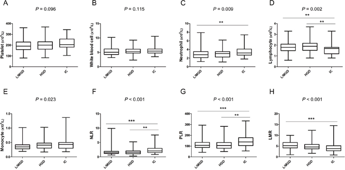Figure 1: Box-plot diagrams were drawn according to the distribution of inflammatory markers in mucinous pancreatic cystic neoplasms stratified by pathology. (A) platelet count; (B) white blood cell count; (C) neutrophil count; (D) lymphocyte count; (E) monocyte count; (F) neutrophil-to-lymphocyte ratio; (G) platelet-to-lymphocyte ratio; (H) lymphocyte-to-monocyte ratio. L/MGD, low-/moderate-grade dysplasia; HGD, high-grade dysplasia; and IC, invasive carcinomas. **, P < 0.01; ***, P < 0.001.
