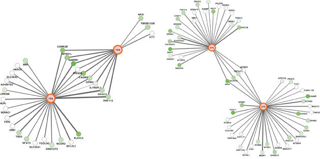 Figure 5: Networks of miRNA-mRNA target interactions in pediatric SEPN. Two highly connected sub-networks from the inferred network of pediatric EPNs comprising 159 putative target interactions between miRNAs and mRNAs. Edge width represents strength of Spearman rank correlation for a given miRNA-mRNA pair, green colour represents evidence of significant downregulation in pSEPN.