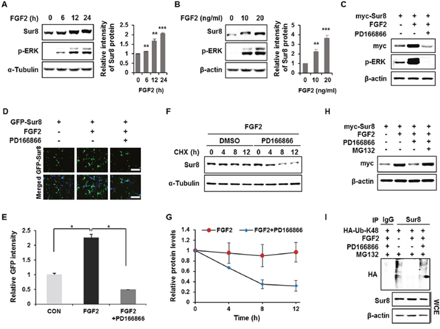 To identify a physiological signaling factor controlling Sur8, we tested the effects of several growth factors on Sur8 levels in human embryonic kidney 293 (HEK293) cells. FGF2, and to a lesser degree epidermal growth factor (EGF), increased Sur8 protein levels without changing Sur8 mRNA levels (Supplementary Figure 1A). FGF2 was more effective in stabilizing Sur8 as confirmed by a time-course analysis (Supplementary Figure 1B). We thus selected FGF2 for further investigation of its regulatory mechanisms of Sur8 stabilization. With FGF2 treatment, Sur8 levels increased, together with ERK activation, in a time- and concentration-dependent manner (Figure 1A and 1B). The increase in Sur8 levels, as well as the ERK activation by FGF2, was abolished with the addition of PD166866, an FGF2 specific inhibitor, as shown by both immunoblot (Figure 1C) and immunocytochemical analyses (Figure 1D and 1E). The effect of FGF2 inhibition on Sur8 stability was further confirmed by using another FGFR inhibitor, AZD4547 (Supplementary Figure 2). By treatment with cycloheximide, Sur8 levels were maintained up to 12 hours in the presence of FGF2. However, co-treatment with PD166866 substantially reduced the half-life of Sur8 (Figure 1F and 1G). FGF2-mediated Sur8 stabilization was attributed to the inhibition of the proteasomal degradation of Sur8 via suppression of its K48-linked polyubiquitination, as demonstrated by effects of MG132 (Figure 1H) and a ubiquitination assay (Figure 1I).