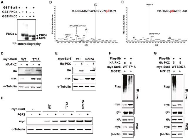Figure 4: Phosphorylation of Sur8 at Thr71 and Ser297 by PKCα and PKCδ, respectively, are responsible for Sur8 degradation. (A) Autoradiography of in vitro kinase assays with recombinant GST-Sur8, GST-PKCα, or GST-PKCδ alone, or GST-Sur8 plus GST-PKCα or GST-PKCδ. Autophosphorylated PKCα and PKCδ proteins, and phosphorylated Sur8 proteins are indicated. (B, C) Identification of phosphorylation sites of Sur8 by liquid chromatography tandem-mass spectrometry (LC-MS/MS). Graphs show representative mass spectrum of Sur8 depicting mass/charge (m/z) of identified PKCα (B) or PKCδ (C) phosphorylation sites. Spectra of the phosphopeptides in the digested Sur8 protein are shown. (D, E) Effects of nonphosphorylatable mutations of Sur8 on PKCα or PKCδ regulation of its stability. HEK293 cells were transfected with 1 μg of myc-Sur8-WT, myc-Sur8-T71A or myc-Sur8-S297A plasmid with or without HA-PKCα (D) or HA-PKCδ (E) plasmid. (F, G) Nonphosphorylatable mutation of T71 or S297 reduces Sur8 ubiquitination. Cells were transfected in the combinations of plasmids as indicated, followed by MG132 treatment for 4 hours before WCEs were immunoprecipitated with anti-myc antibody. (H) Cells were transfected with Sur8 nonphosphorylatable mutants and treated with FGF2 as indicated. WCEs were subjected to immunoblot analysis using the indicated antibodies (D-H).