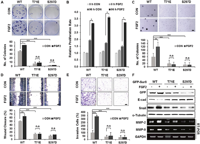Figure 5: Wild-type Sur8, but not phosphomimetic mutations, mediates FGF2-induced cellular transformation, migration, and invasion. (A-F) GFP-Sur8-WT, GFP-Sur8-T71E, or GFP-Sur8-S297D which were rescued in DLD-1 Sur8-KO cells were treated with PBS (control) or FGF2 and assessed for transformation, proliferation, migration, and invasion potential, and were subjected to immunoblot and RT-PCR analyses. Foci-forming assays were conducted for 2 weeks. Quantifications of colony number are shown in (A). Normal (B) and anchorage-independent (C) cell growth rates were determined by MTT and soft agar assays, respectively. Cells were scratched and allowed for wound closure for 48 hours after treatment with or without FGF2. Representative images of wound closure and quantification of relative wound closure efficiency are shown in (D). Invasion assays were performed using matrigel-coated chambers, and the relative quantification of invaded cells were measured as shown (E). Colonies and cells were stained with crystal violet (A, C-E). Statistical values were *P < 0.05, **P < 0.01, ***P < 0.001. Scale bars, 500 μm. WCEs were subjected to immunoblot analysis and total RNAs were subjected to RT-PCR analysis (F).