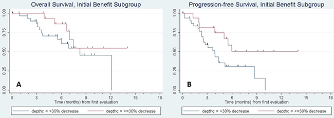 Figure 2: Kaplan–Meier curve of (A) progression-free survival and (B) overall survival of patients with initial benefit based on depth of response. The red curve denotes patients with ≥30% response in tumor size by RECIST criteria to anti-PD-1/PD-L1 therapy, while the blue line denotes response <30%. On multivariate cox regression analysis, PFS and OS were significantly longer for patients with increasing depth of response, with a hazard ratio (HR) of 0.74, 95% CI (0.62, 0.89), p = 0.002 for PFS and HR of 0.79 (0.65, 0.93), p = 0.006 for OS per every 10% increase in depth of response.