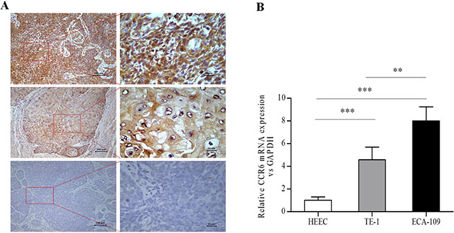 Figure 1: Analysis of CCR6 expression in esophageal tissues and CCR6 mRNA in esophageal cell lines. (A) Immuno-intensity of CCR6 (brown) in ESCC tissues and normal esophageal tissue. Top two slides represent high immunological staining strength; in the middle two, the immune-staining intensity is moderate, and the bottom two are shown to indicate weak immune-staining. (B) CCR6 mRNA levels were significantly higher in ESCCcells (ECA-109, TE-1) compared to normal esophageal epithelial cells (HEEC). CCR6 mRNA was only expressed at a low level in HEEC. (**P < 0.01, ***P < 0.001).