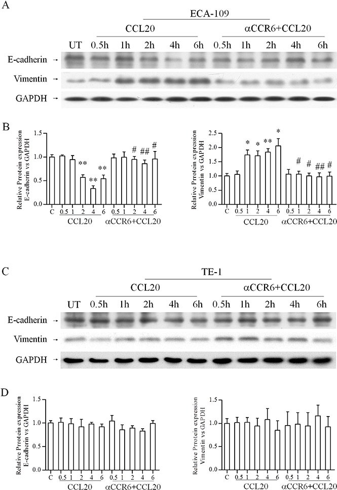 Figure 3: Effects of CCR6-CCL20 interactions on EMT of ESCC cell on protein level. (A–D) The protein expression changes of E-cadherin and Vimentin in ESCC cell lines: ECA-109 (A, B), TE-1(C, D) after CCL20 treating and blocking CCR6 were showed. GAPDH was used as a loading control. ( *P < 0.05, **P < 0.01, #P < 0.05, ##P < 0.01).