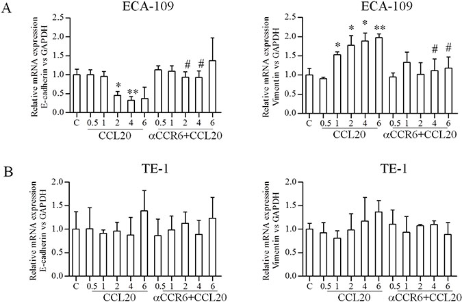 Figure 4: Effects of CCR6-CCL20 interactions on EMT of ESCC cell on mRNA level. (A, B) QRT-PCR analysis was used to confirm E-cadherin and Vimentin protein expression results on mRNA level. GAPDH was used as a loading control. (*P < 0.05, **P < 0.01, #P < 0.05).