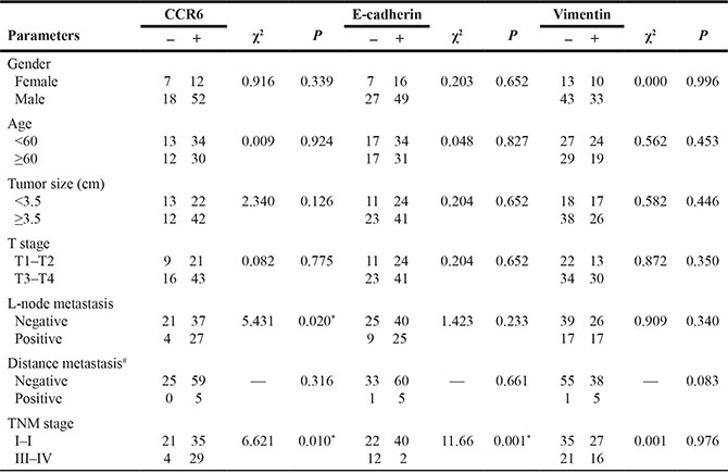 Table 1: Correlation of CCR6, E-cadherin and Vimentin expression with clinical data from ESCC patients