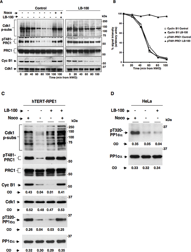 Figure 1: Effects of the PP2A inhibitor LB-100 on SAC maintenance and resolution in HeLa and hTERT-RPE1 cells. Nocodazole-treated, prometaphase-arrested, HeLa cells were collected. Upon nocodazole wash out, cells were divided into two sets, one received vehicle (DMSO) as control and the other LB-100 (10 μM). Cells were then taken at the indicated time points of further incubation. Two cell samples in the control set also received again nocodazole (Noco) and one of them LB-100 (LB-100) and, then, were taken at the indicated time points of further incubation. (A) Total samples were separated on SDS/PAGE and immunoblotted for phosphorylated Cdk1 substrates (Cdk1 p-subs), pT481-PRC1, PRC1, cyclin B1 (Cyc B1) and Cdk1. (B) Optical pT481-PRC1 (triangles) and cyclin B1 (squares) signal density (arbitrary units; normalized for total PRC1 and Cdk1 optical density values, respectively) were plotted as percent of time 0 samples from control (open symbols) and LB-100-treated (filled symbols) cells. (C) Nocodazole-treated, prometaphase-arrested, hTERT-RPE1 cells were collected. Upon nocodazole wash out, cells were further incubated for 90 min in: fresh medium plus nocodazole (Noco+), just fresh medium (Noco−), fresh medium plus LB-100 (Noco– LB-100+) or fresh medium plus nocodazole and LB-100 (Noco+ LB-100+). Total samples were separated on SDS/PAGE and immunoblotted for the indicated antigens. OD, optical density values of above signals (arbitrary units). (D) Nocodazole-treated, prometaphase-arrested, HeLa cells were collected. Upon nocodazole wash out, cells were further incubated for 90 min in: fresh medium plus nocodazole (Noco+), just fresh medium (Noco−), fresh medium plus 10 μM LB-100 (Noco– LB-100+). Total samples were separated on SDS/PAGE and immunoblotted for the indicated antigens. OD, optical density values of above signals (arbitrary units). The data shown are representative of four independent experiments performed under identical conditions and giving similar results.