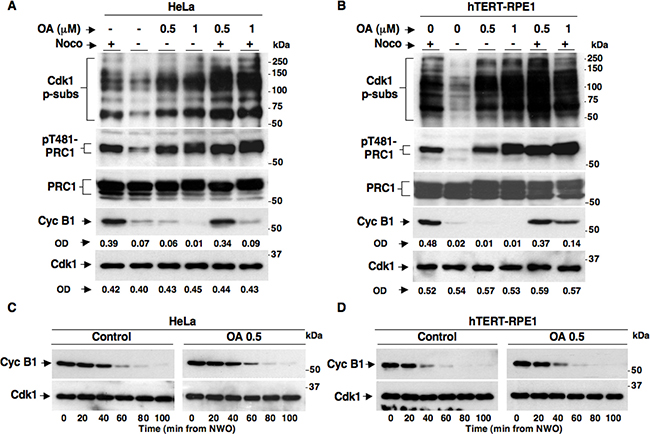 Figure 2: SAC maintenance and resolution in HeLa and hTERT-RPE1 cells treated with the phosphatase inhibitor Okadaic Acid. Nocodazole-treated, prometaphase-arrested, (A) HeLa and (B) hTERT-RPE1 cells were collected. Upon nocodazole wash out cells were further incubated for 90 min in: fresh medium plus nocodazole (Noco+), just fresh medium (Noco−), fresh medium plus OA at 0.5 μM (Noco− OA 0.5), fresh medium plus OA at 1 μM (Noco− OA 1), fresh medium plus nocodazole and OA at 0.5 μM (Noco+ OA 0.5) and fresh medium plus nocodazole and OA at 1 μM (Noco+ OA 1). Nocodazole-treated, prometaphase-arrested (C) HeLa and (D) hTERT-RPE1 cells were collected. Upon nocodazole wash out, cells were divided into two sets, one received vehicle as control (Control) and the other OA at 0.5 μM (OA 0.5). Cells were then taken at the indicated time points of further incubation. Total samples were separated on SDS/PAGE and immunoblotted for the indicated antigens. OD, optical density values of above signals (arbitrary units). The data shown are representative of four independent experiments per type performed under identical conditions and giving similar results.