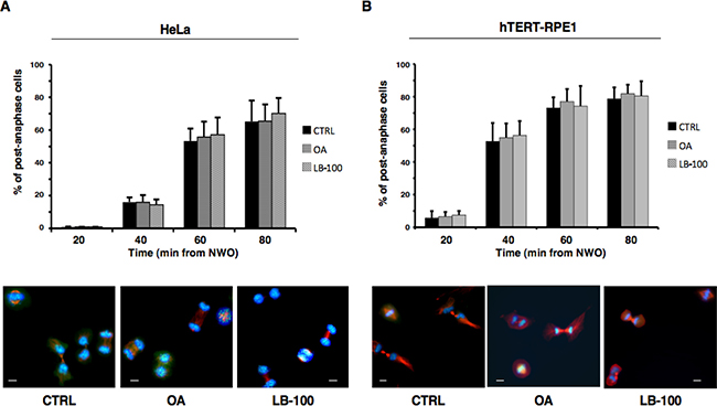 Figure 3: PP2A activity does not substantially affect progression beyond anaphase. Nocodazole-treated, prometaphase-arrested, (A) HeLa and (B) hTERT-RPE1 cells were collected. Upon nocodazole wash out, cells were divided into three sets that received either vehicle as control (CTRL), OA at 0.5 μM (OA), or LB-100. Cells were then taken at the indicated time points of further incubation and spun onto microscopy slides and processed for immunofluorescence staining for α-tubulin and the centromere marker CREST, DNA was stained with Hoechst. Upper graphs: post-anaphase cells were visually scored through microscopy. Error bars refer to variation within three independent experiments performed under identical conditions. Lower photographs: indicative images of HeLa and hTERT-RPE1 cells taken at 60 or 40 min, respectively, of incubation. Scale bars, 10 μm.