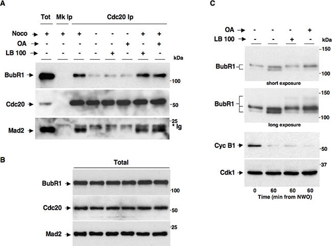 Figure 4: PP2A activity does not affect MCC maintenance and disassembly. Nocodazole-treated, prometaphase-arrested, HeLa cells were washed out of nocodazole and further incubated for 60 min in: fresh medium plus nocodazole (Noco+), just fresh medium (Noco−), fresh medium plus LB-100 (10 μM; Noco− LB-100+), fresh medium plus OA (0.5 μM; Noco− OA+), fresh medium plus nocodazole and LB-100 (10 μM; Noco+ LB-100+) and fresh medium plus nocodazole and OA (0.5 μM; Noco+ OA+). Cdc20 was immunoprecipitated (Ip) from cell lysates. (A) Cdc20 Ips (Cdc20 Ip) were resolved on SDS/PAGE and subsequently probed by immunoblotting for the indicated antigens (a total cell lysate, Tot; and mock Ip, Mk Ip, were also included as control in the SDS/PAGE; the asterisk marks immunoglobulin signal, *Ig). (B) Total lysates were also probed for the indicated antigens. (C) Nocodazole-treated, prometaphase-arrested, HeLa cells were washed out of nocodazole and further incubated for 60 min in: fresh medium (LB-100- OA−), fresh medium plus LB-100 (10 μM; LB-100+ OA−) or fresh medium plus OA (0.5 μM; LB-100- OA+). BubR1 was probed on blots of long, higher resolving, SDS/PAGE runs of total lysates (short and long blot exposures are shown). Total lysates were also probed for the other indicated antigens. The data shown are representative of three independent experiments performed under identical conditions and giving similar results.