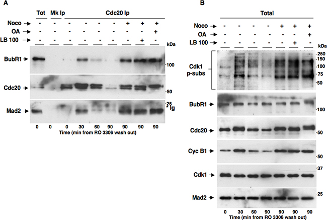 Figure 5: PP2A activity does not affect MCC formation and implementation of SAC-dependent mitotic arrest. HeLa cells were treated for 18 hours with RO3306 (10 μM). Upon RO3306 wash out, cells were released into: fresh medium (Noco− OA− LB-100-), fresh medium plus nocodazole (Noco+ OA− LB-100-), fresh medium plus nocodazole and LB-100 (Noco+ OA− LB-100+) and fresh medium plus nocodazole and OA (Noco+ OA+ LB-100-). Cell samples were taken at the indicated time points of further incubation and (A) Cdc20 Ips (Cdc20 Ip) were resolved on SDS/PAGE and subsequently probed by immunoblotting for the indicated antigens (a total cell lysate, Tot; and mock Ip, Mk Ip, were also included as control in the SDS/PAGE; the asterisk marks immunoglobulin signal, *Ig). (B) Total lysates were also probed for the indicated antigens. The data shown are representative of four independent experiments performed under identical conditions and giving similar results.