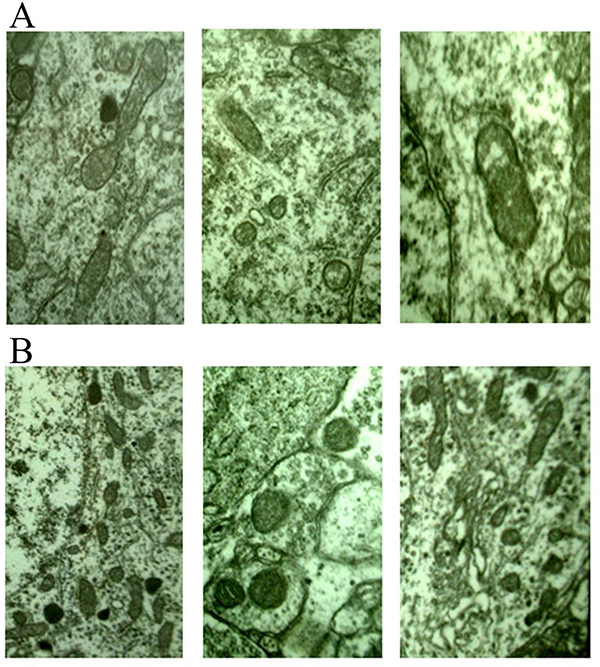 Figure 4: (A) 6 hours after stroke, mitochondrion edema was seen (×20000) from different views; (B) 24 hours after stroke, mitochondrion edema was severe, the number of lipofascin paoticles were decreased (×20000) from different views.