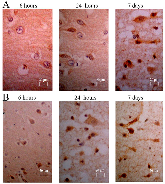 Figure 5: Immunohistochemistry for NGF of canines’ brain. (A) The number of positive cells was increased gradually, and the degree of straining also was increased gradually; (B) The counts and degree of straining were more in those treated canine from group D (NGF treatment for 3 months).