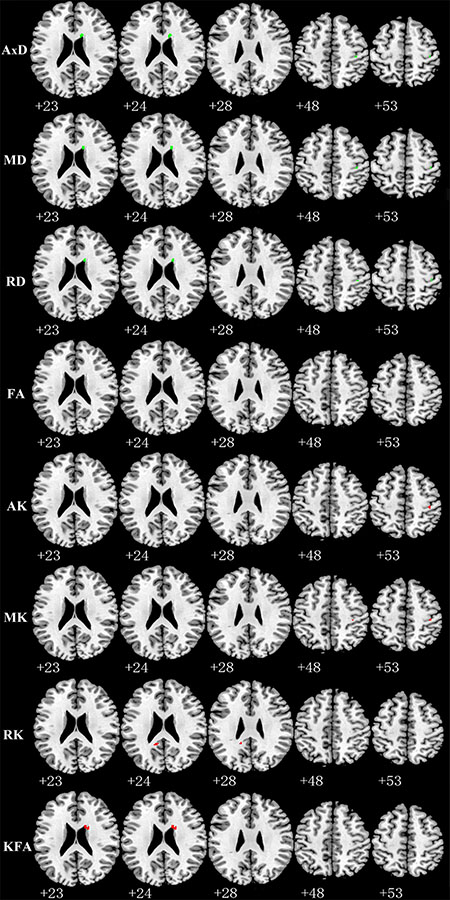 Abbreviation: AxD: axial diffusivity; MD: mean diffusivity; RD: radial diffusivity; FA: fractional anisotropy; AK: axial kurtosis; MK: mean kurtosis; RK: radial kurtosis; KFA: kurtosis fractional anisotropy.