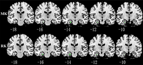 Figure 3: Representative coronal images show increased MK and RK in parahippocampus (p < 0.001, with a minimum cluster size 10) in KIBRA C-allele carriers compared with TT carriers. Abbreviation: MK: mean kurtosis; RK: radial kurtosis.