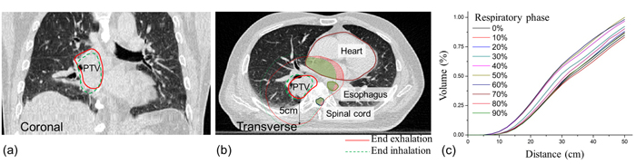Figure 3: Illustration of the changes of geometric relationships between the PTV and OARs (esophagus, heart and spinal cord) in different respiratory phases. (a) phase–wise PTVs in a coronal CT image, (b) phase-wise expanded PTVs and OARs in an axial CT image, and (c) example of OVH curves for esophagus.