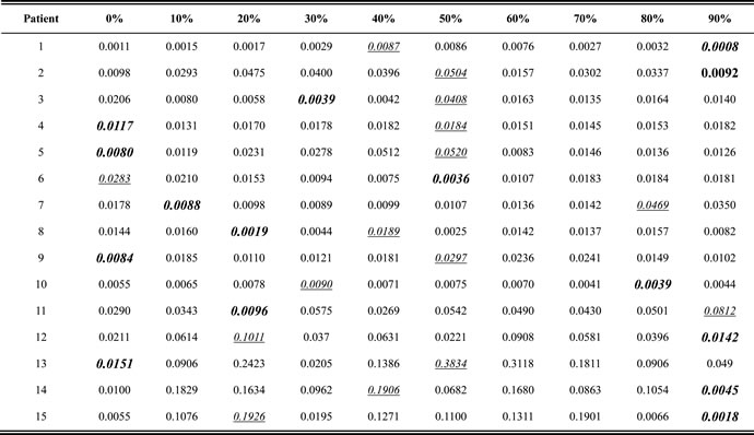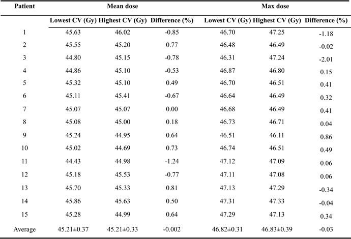 Table 3 summarizes PTV dose indices acquired from the extreme two phases for 15 patients. It shows that the average differences of the PTV mean and max doses were -0.002% and -0.03%, respectively. As shown, the PTV dose indices were very similar for the phases of extreme two cost values for all patients, implying that plan quality in PTV coverage perspective was consistent.