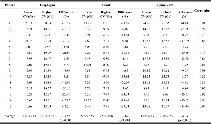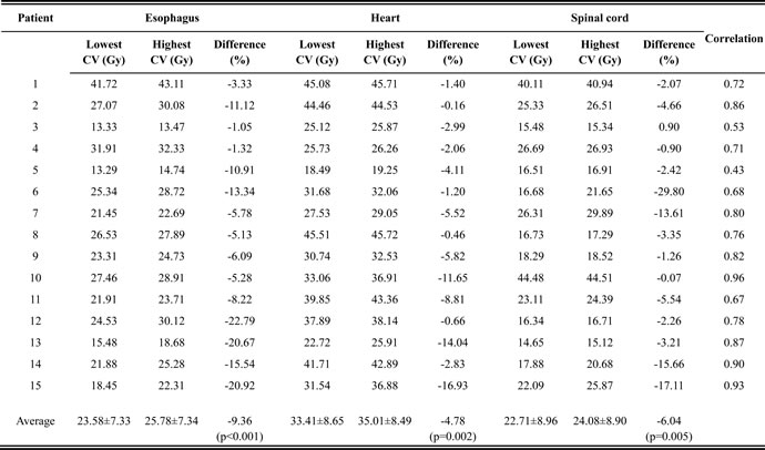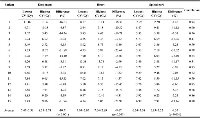 The max doses of the OARs at the phases of extreme two cost values are summarized in Table 6. The max doses of the OARs were lower at the phase with the lowest cost value compared to the phase with the highest cost value. However, the decrease of the max dose at the phase with the lowest cost value was less than that of mean dose. The average max doses also significantly decreased for all of 3 organs (by 9.36% [with p-value < 0.001] for esophagus; by 4.78% [with p-value = 0.002] for heart; by 6.04% [with p-value = 0.005] for spinal cord).