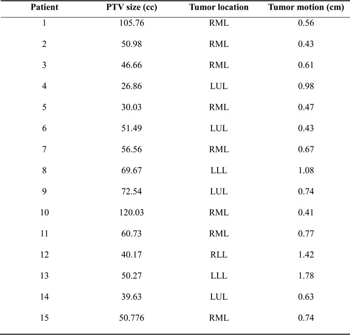 Table 7: PTV size, tumor location at end exhalation, and 3D tumor motion for all patients (N = 15).