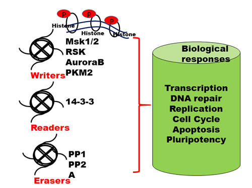 Figure 1: Writers, readers and erasers of histone marks. Reversible PTMs addition, identification and removal of these modifications on histone tails regulate various biological processes, including transcription, DNA replication and DNA repair and are highly dynamic in nature. The "writers" such as histone protein kinases add specific PTMs on specific amino acid residues on core histone tails. These marks are identified by specific protein domains called "readers" such as 14-3-3 proteins. The PTM marks are removed by active enzymes known as "erasers" such as phosphatases; Abbreviations: RSK, ribosomal protein S6 kinase A3; AuroraB, serine/threonine protein kinase Aurora B; PKM2, pyruvate kinase M2; Msk1/2, Mitogen- and stress-activated protein kinase 1 and 2, PP, protein phosphatases.