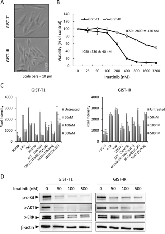Figure 1: Characterization of the imatinib-resistant GIST cell line, GIST-IR. (A) The appearance of imatinib-resistant GIST cells, GIST-IR cells, shows a spindle-like shape without obvious morphological changes from the parental cell, GIST-T1 cells. (B) 5.0 × 103 GIST-T1 or GIST-IR cells were plated in 96-well plates and cultured with imatinib (25 - 3200 nM). After 48 hours, cell viability was measured by WST-8 assay. Imatinib showed efficacy against GIST-T1 and GIST-IR cells with IC50s of 230 ± 40 nM and 2800 ± 470 nM, respectively. (C) Expression of activated tyrosine kinase receptors and downstream signals in GIST-T1 and GIST-IR cells, and the effect of imatinib on their phosphorylation status were evaluated using RTK signaling antibody array. Bar graphs represent the quantified receptor tyrosine kinase (RTK) signaling antibody array images. Results represent the mean ± SD of three experiments performed in triplicate. (D) Protein extract from GIST-T1 and GIST-IR cells incubated in culture media supplemented with the indicated concentration of imatinib for 48 hours was immunoblotted with anti-c-Kit (Tyr719), anti-phospho-AKT (Ser473), anti-phospho-ERK1/2 (Thr202/Tyr204). β-actin is shown as a loading control.