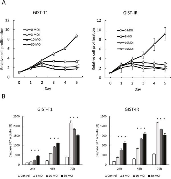 Figure 2: Growth inhibition and apoptosis induction by reovirus in GIST-T1 and GIST-IR cells in vitro. (A) 3.0 × 103 GIST-T1 or GIST-IR cells were plated in 96-well plates and treated with reovirus, and cell proliferation was measured by WST-8 assay. (B) 5.0 × 103 GIST-T1 or GIST-IR cells were plated in 96-well plates and treated with 3, 10, and 30 multiplicity of infection (MOI) of reovirus. Apoptosis induction by reovirus in each cell type was evaluated by measuring caspase-3/7 activity. Each result represents the mean ± SD of three experiments performed in triplicate. *P<0.01, compared to controls.
