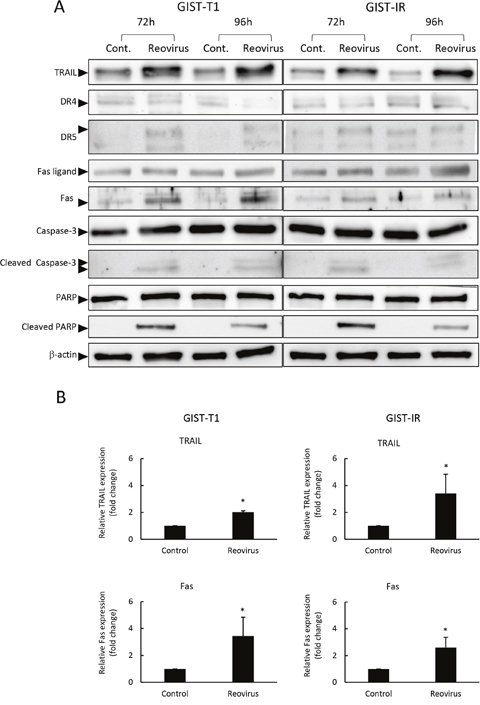 Figure 3: Reovirus enhanced TRAIL and Fas expression in GIST-T1 and GIST-IR cells. (A) Western blot analysis showed changes in apoptosis-related proteins, TRAIL, cell surface death receptors (DR) 4, DR5, Fas ligand, Fas, caspase-3, and poly ADP ribose polymerase (PARP) in GIST-T1 and GIST-IR cells following treatment with 10 MOI of reovirus for 72 or 96 hours. (B) Relative expression of TRAIL and FAS proteins in GIST-T1 and GIST-IR with or without 10 MOI of reovirus for 96 hours quantified by densitometry using imageJ software. Each result represents the mean ± SD of three experiments. *P<0.01, compared to controls.