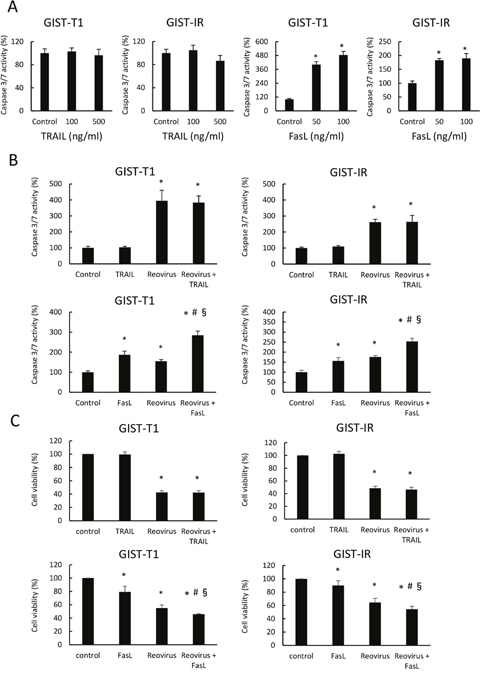 Figure 4: Combination treatment of FasL and reovirus significantly induced apoptosis in GIST-T1 and GIST-IR cells. (A) Caspase 3/7 activity was measured in GIST-T1 and GIST-IR cells treated with TRAIL or FasL for 24 hours. (B) Caspase 3/7 activity was evaluated in GIST-T1 and GIST-IR cells treated with 10 MOI reovirus treatments for 24 hours, and subsequently treated with TRAIL or FasL for 24 hours. (C) Cell viability was evaluated in GIST-T1 and GIST-IR cells treated with 10 MOI reovirus treatments for 48 hours, and subsequently treated with TRAIL or FasL for 48 hours. Each result represents the mean ± SD of three experiments performed in triplicate. *P <0.01, compared to control; #P <0.01, compared to FasL alone; §P <0.01, compared to reovirus alone.