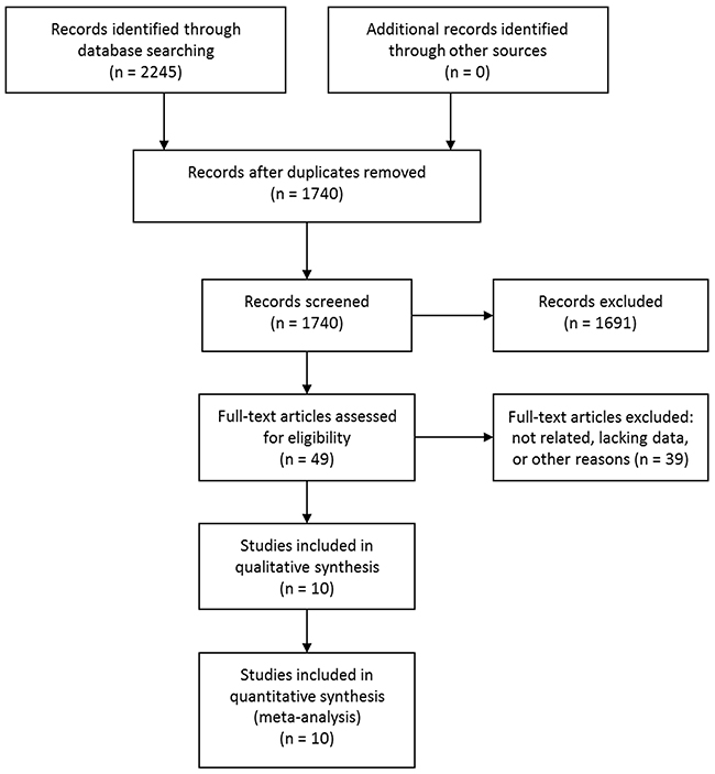 The initial database searching identified 2245 studies. No additional studies were identified through other sources. After removing duplicates, 1740 studies were screened by titles and abstracts. According to the predefined inclusion and exclusion criteria, 1691 studies were excluded. The rest 49 studies were evaluated in full text and 37 were further excluded due to unrelated, lacking enough data or other reasons. Two articles were from the same study cohort [28, 30], and the study with shorter follow-up time was excluded [28]. Another two articles were also from the same study cohort [29, 31], and the study with smaller sample size was excluded [31]. Eventually, 10 articles [10, 16-18, 29, 30, 32-35] met the inclusion criteria and were included. Of note, although two studies were from the same study cohort [10, 16], one study examined the risk of all types of stroke and the other examined the risk of intracerebral hemorrhage, so they were not pooled together during the analysis and were both included. The study selection process was shown in Figure 1.