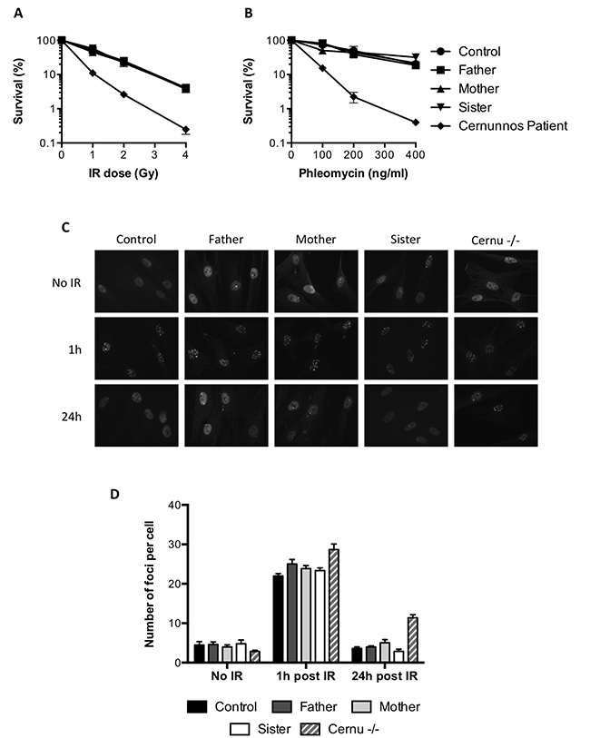 Figure 2: Functional NHEJ in the MMC-resistant individuals. (A, B) Survival of the father, mother, sister, a healthy control and a Cernunnos deficient patient exposed to increasing doses of ionizing radiations (A) or phleomycin (B). Results shown as mean ± SD of duplicates are representative of three independent experiments. (C, D) Primary fibroblasts from the father, mother, sister, a healthy control and a Cernunnos deficient patient (Cernu–/–) were either left untreated or irradiated with 0.5 Gy and further incubated for 1 or 24 h before fixation and 53BP1 immunostaining. (C) Representative images of 53BP1 staining. (D) Number of 53BP1 foci per cell (mean ± SEM) quantified in at least 50 nuclei from 3 independent experiments.