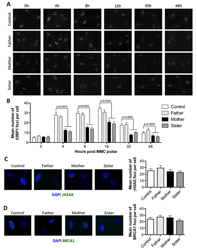 Figure 3: The attenuated sensitivity to MMC is associated with a reduced recruitment of 53BP1 at ICLs. (A–B) Recruitment of 53BP1 following MMC treatment. Primary fibroblasts from the father, mother, sister, and a healthy control were pulsed for 1 hour with 1 μg/ml MMC and further incubated for the indicated times before fixation and 53BP1 immunostaining. (A) Representative images. (B) Number of foci per cell as quantified from at least 100 nuclei from 3 independent experiments, shown as mean ± SEM. Statistical analyses were performed using Mann-Whitney tests comparing each sample with the control at the corresponding time point. (C–D) Cells treated as in A were incubated for 16 h before fixation and γH2AX (C) or BRCA1 (D) immunostaining. Left panel show representative images. Right panel show the mean number of foci per cell calculated as in B.
