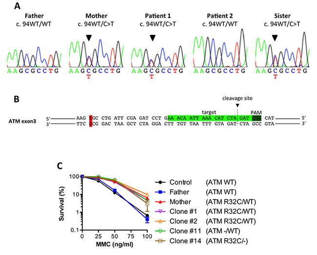 Figure 5: The ATM R32C mutant allele found in MMC-resistant individuals is dispensable for the enhanced survival. (A) Sanger sequencing showing a heterozygous 94C>T mutation in the ATM gene for the mother, P1 and its sister. (B) CRISPR-Cas9 target sequence in exon 3 of human ATM. (C) MMC survival of a healthy control, the father, the mother and clones #1, 2,11 and 14. Results shown as mean ± SD of duplicates are representative of 3 independent experiments.