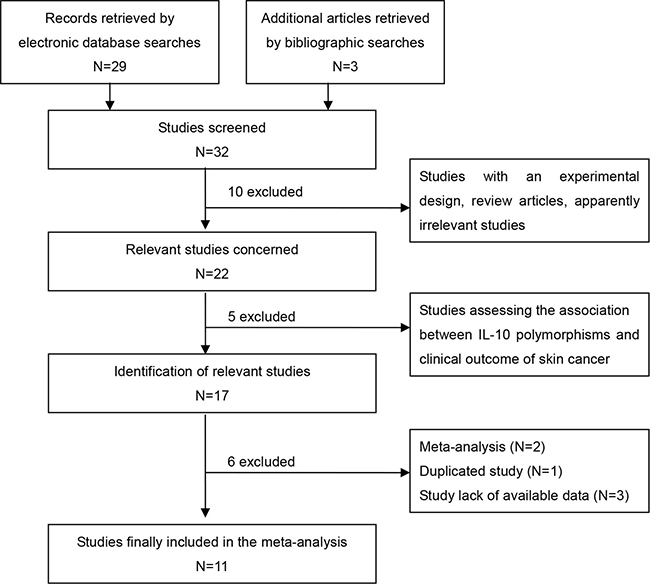 Studies identified for inclusion subsequent to an eligibility evaluation were required to satisfy the following criteria: (1) studies concerning the associations between three common IL-10 polymorphisms(–1082G>A, –819C>T and –592C>A) and skin cancer risk; (2) studies with a case-control or cohort design; (3) all the cases with a pathological confirmation in the studies; (4) studies providing sufficient information on the genotype distribution in case and control groups or necessary information to calculate the odds ratios (ORs) and 95% confidence intervals (95% CIs).