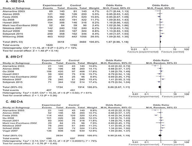 Figure 2: Forest plots of skin cancer risk associated with IL-10 gene –1082G>A, –819C>T and –592C>A polymorphisms (A–C) in the allele contrast (A vs. G; T vs. C; A vs. C, respectively).