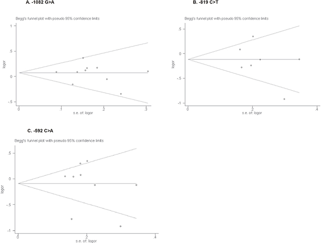 Figure 3: Begg’s funnel plots for publication bias test on the associations of IL-10 gene –1082 G>A, –819C>T and –592C>A polymorphisms (A–C) with skin cancer risk in the allele contrast (A vs. G; T vs. C; A vs. C, respectively).