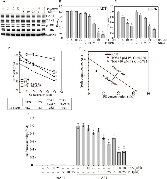 Figure 4: AKT and MAPK signaling-mediated cell growth regulation after α-TOS and PS treatment in MDA-MD-231 cells. (A) Dose-dependent AKT and MAPK protein activation after treatment with α-TOS (0–25 μM) and PS (0–25 μM) alone or in combination. (B) Densitometry analysis of AKT and (C) ERK phosphorylated protein expression. (D) The IC50 of each drug treatment was calculated as the drug concentration able to reduce cell viability by 50%. (E) CI values of α-TOS and PS treatment on MDA-MB-231 IC50. The red dot and green triangle represent the synergistic effects of α-TOS treatment with 5 μM and 10 μM PS, respectively. (F) Luciferase activity of MDA-MB-231 cells transfected with either pGL3 (5′ AP1) or pGL3 (5′ mAP1) plasmids and treated with different concentrations of α-TOS (0–25 μM) or PS (0–25 μM) for an additional 12 hours. All statistical tests were two-sided and compared to non-treatment control. P-values less than 0.05 are indicated with an asterisk and those less than 0.01 are indicated with two asterisks.
