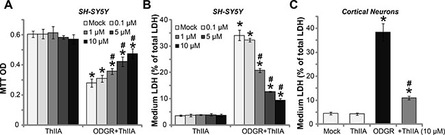 Figure 1: Tanshinone IIA protects neuronal cells from oxygen glucose deprivation and re-oxygenation. SH-SY5Y neuronal cells (A–B) or the primary murine cortical neurons (C), pre-treated (for 30 min) with indicated concentration of Tanshinone IIA (“ThIIA”), were exposed to oxygen glucose deprivation (OGD, for 4 hours) and re-oxygenation (for 24 hours, ODGR), cell survival was tested by MTT assay (optic density, or OD at 550 nm was recorded, (A); Cell death was tested by LDH release (B and C). “Mock” stands for normoxia treatment (Same for all Figures). Data were presented as mean ± SD (n = 5). *P < 0.05 vs. “Mock” group. #P < 0.05 vs. ODGR only treatment (no ThIIA pre-treatment). Experiments in this figure were repeated four times, and similar results were obtained.