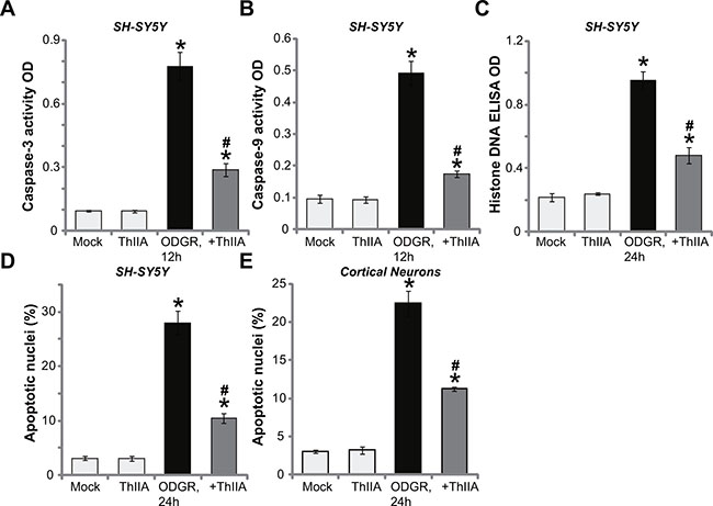 Figure 2: Tanshinone IIA inhibits OGDR-induced neuronal cell apoptosis. SH-SY5Y neuronal cells (A–D) or the primary murine cortical neurons (E), pre-treated (for 30 min) with 10 μM of Tanshinone IIA (“ThIIA”), were exposed to oxygen glucose deprivation (OGD, for 4 hours) and re-oxygenation (for applied hours, ODGR), the cell apoptosis assays mentioned in the text were performed. Data were presented as mean ± SD (n = 5). *P < 0.05 vs. “Mock” group. #P < 0.05 vs. ODGR only treatment (no ThIIA pre-treatment). Experiments in this figure were repeated three times, and similar results were obtained.
