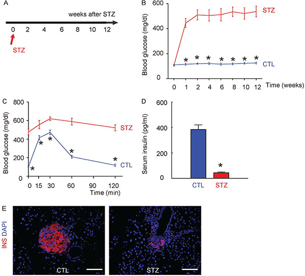 Figure 1: Induction of diabetes in mice by STZ administration. (A) A single intraperitoneal injection of beta cell toxin STZ was used to induce diabetes (STZ) and DR in mice. The control mice (CTL) received an intraperitoneal injection of an equivalent volume of normal saline at the same time of STZ administration. The mice were followed up for 12 weeks. (B) Fasting blood sugar. (C) IPGTT. (D) Serum insulin content. (E) Representative immunostaining for insulin (INS) on pancreas sections at 12 weeks after STZ. DAPI: nuclear staining. *p < 0.05. N = 10. Scale bars are 50 μm.