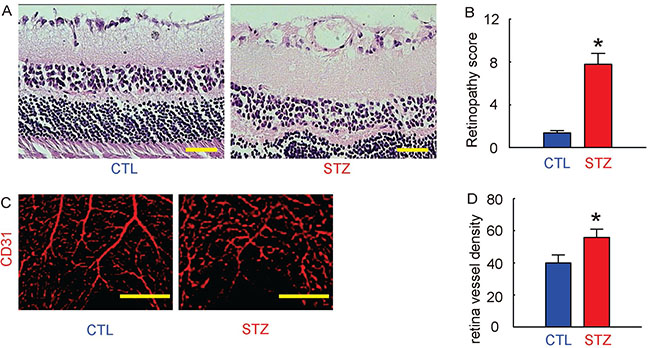 Next, we examined whether STZ treatment had induced DR in these mice. We found that 12 weeks after STZ, the retinopathy score in STZ mice was significantly increased, compared to the control mice, shown by representative histological images (Figure 2A), and by quantification (Figure 2B). The CD31 staining was performed on retinal tissue, shown by representative images (Figure 2C). We found that the vessel density in eyes in STZ mice was also significantly increased, compared to the control mice (Figure 2D). Together, these data suggest that STZ treatment induced DR in these mice in 12 weeks.