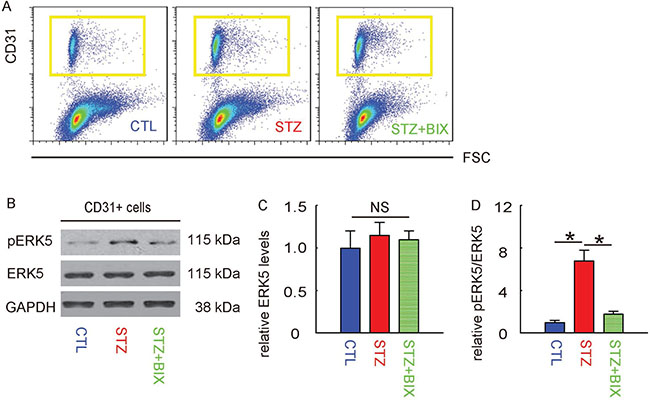 Figure 5: Activation of ERK5 signaling in retinal endothelial cells by STZ is suppressed by BIX. (A) Mouse retina were thus isolated and dissociated into single cells for flow cytometry-based purification of CD31+ retinal endothelial cells, shown by representative flow charts. (B) Representative Western blotting images of ERK5 and phosphorylated ERK5 (pERK5) in CD31+ retinal endothelial cells. (C) Quantification of ERK5 levels (normalized to GAPDH). (D) Quantification of pERK5 levels (normalized to ERK5). *p < 0.05. NS: non-significant. N = 10.